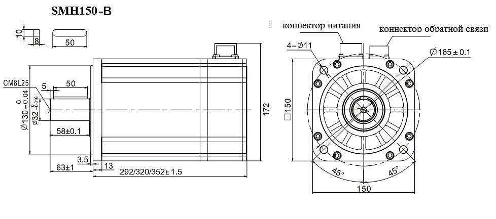 Сервомотор SMH150 и SMH150-B Номинальная мощность - 2300 Вт, 3000 Вт и 3800 Вт Момент удержания - 12.0Nm , 15.0Nm и 20,0Nm