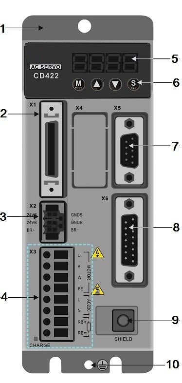 Сервоусилитель CDII432 (AC220V) Описание коммуникационных портов сервоусилителей CDII Схемы подключения для режимов Сервоусилитель CD422 (АС220V) Обозначение Рисунок. 1 – Алюминиевый корпус Кожух радиатора 2 – X1 COM1, DIN1… DIN 7: 7 дискретных ...