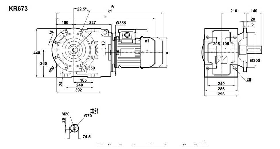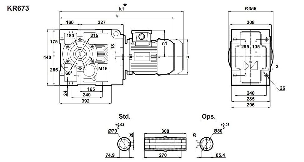 Диаметр выходного вала в стандартном исполнении составляет d=70, в опциона льном исполнении d=80.