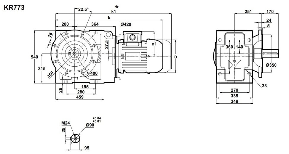 Конические редукторы KR773 предназначены для получения крутящего момента 1800Nm - 8800Nm, при эксплуатации совместно с трехфазным электродвигателем мощностью 30KW переменного тока, и оборотами выходного вала в диапазоне: 31 об/мин ~ 189 об/мин.Прочный чугунный корпус, износостойкий конический редукторный механизм, в целом, эффективная конструкция - очевидные плюсы привода.