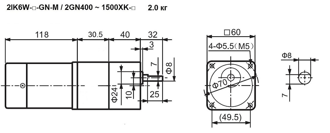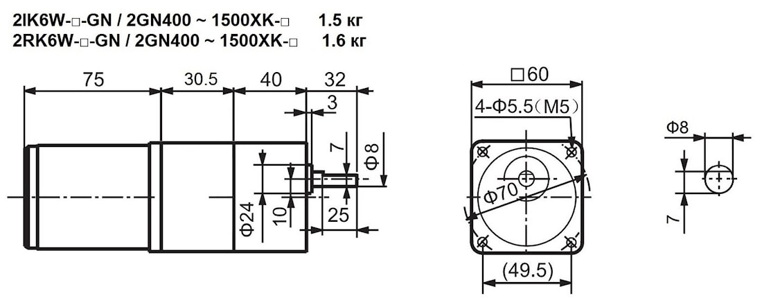 | 2IK6W-GN 2RK6W-GN 2IK6W-GN-M | 2GN400XK | - | 8 | 3.8 | 400 | 3.0 | Стандарт – 1.5 С тормозом – 2.0 |