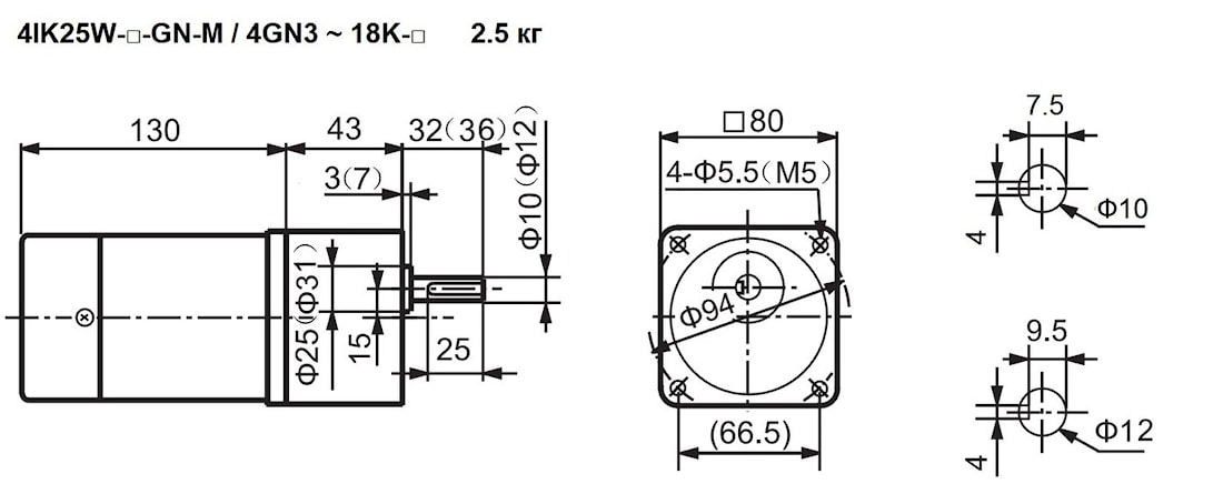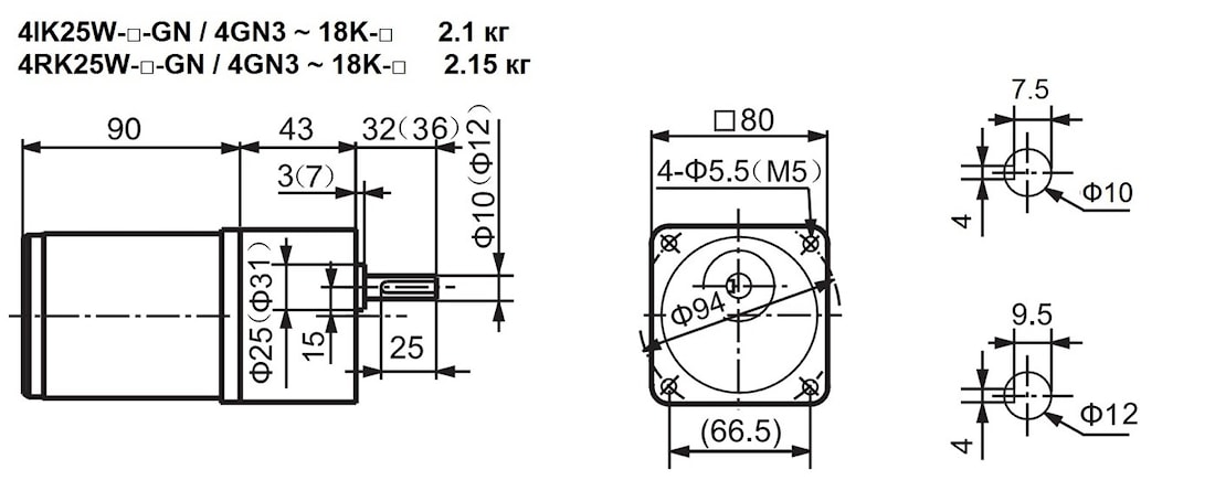 | 4IK25W-GN 4RK25W-GN 4IK25W-GN-M | 4GN3K | 10, 12 | - | 500 | 3.0 | 0.50 | Стандарт – 2.1 (2.15) С тормозом – 2.5 |