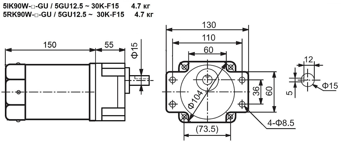 | 5IK90W-GU 5IK90W-GU 5IK90W-GU-M | 5GU12.5K | 12, 15 | - | 120 | 12.5 | 6.4 | Стандарт – 4.7 Фланец – 4.7 С тормозом – 5.2 |