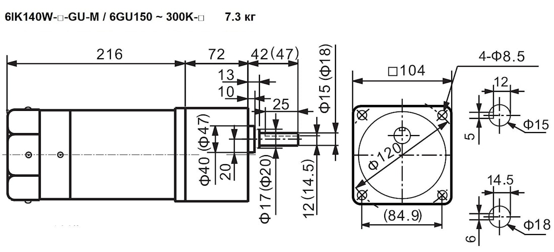 | 6IK140W-GU 6IK140W-GU-M | 6GU150K | 15, 18 | - | 10 | 150 | 33 | Стандарт – 4.9 С тормозом – 5.4 |