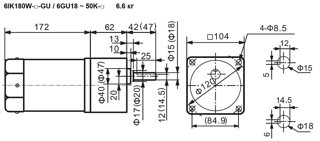 | 6IK180W-GU 6IK180W-GU-M | 6GU18K | 15, 18 | - | 83 | 18 | 18 | Стандарт – 6.6 С тормозом – 7.3 |