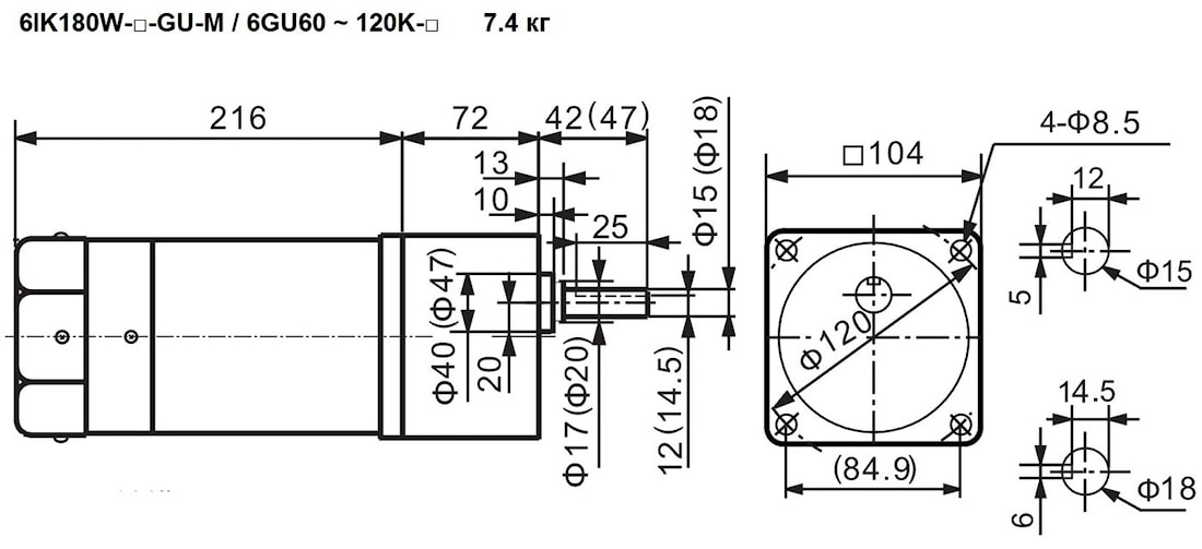 | 6IK180W-GU 6IK180W-GU-M | 6GU60K | 15, 18 | - | 25 | 60 | 48 | Стандарт – 6.7 С тормозом – 7.4 |