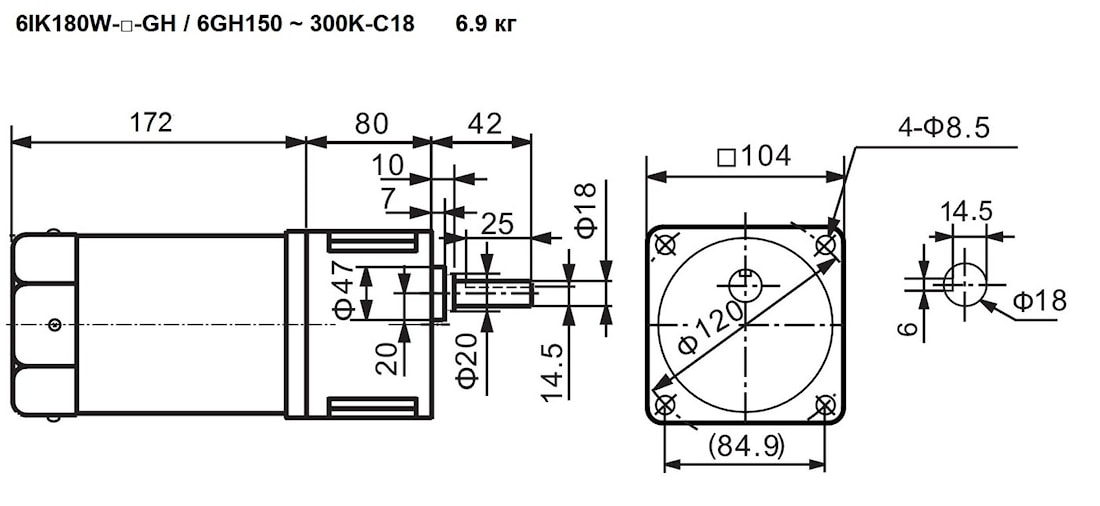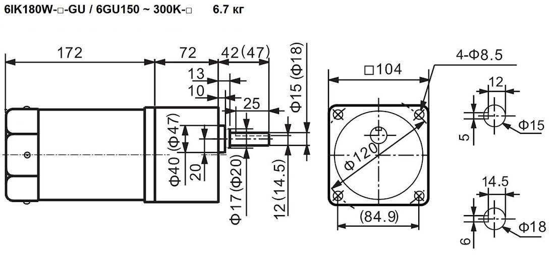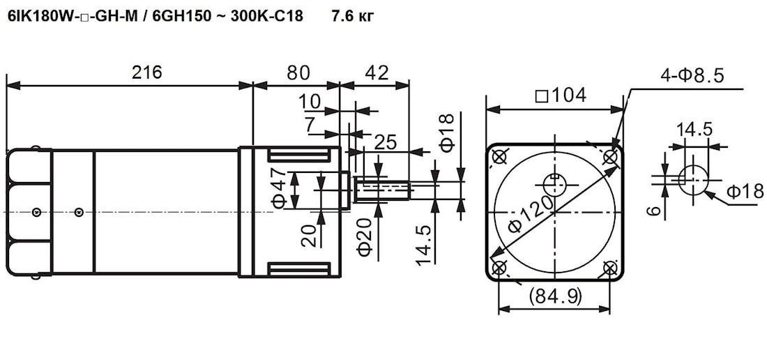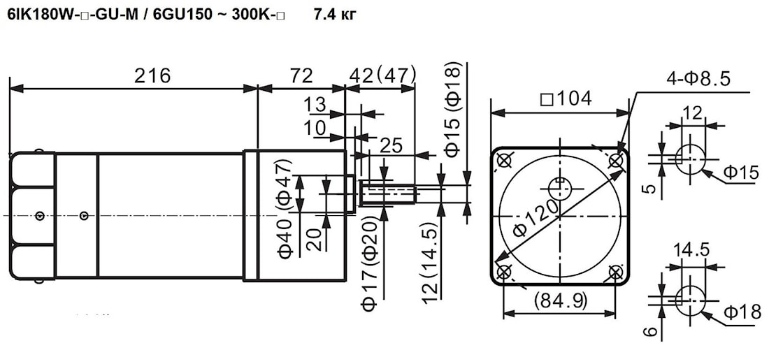 | 6IK180W-GU(GH) 6IK180W-GU(GH)-M | 6GU(GH)120K | 15, 18 | - | 12.5 | 120 | 55 | Стандарт – 6.7 Износостойкий – 6.9 С тормозом – 7.4 (7.6) |