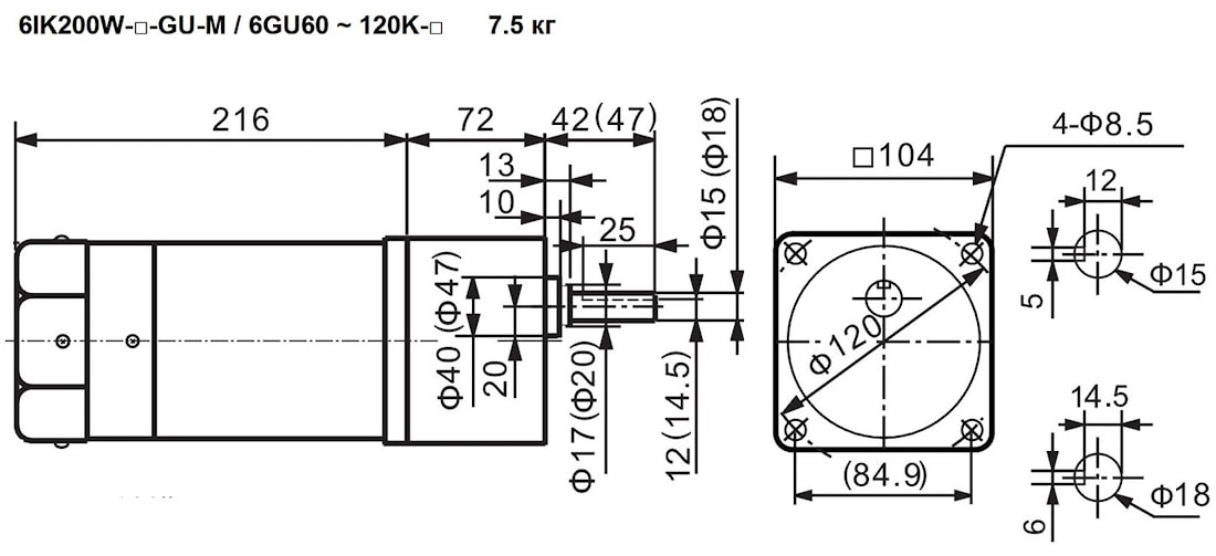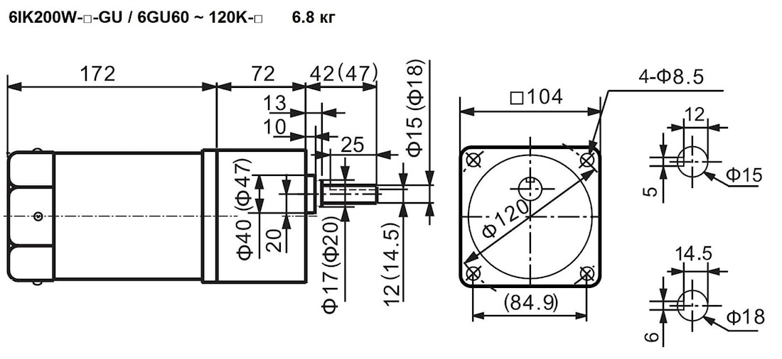 | 6IK200W-GU 6IK200W-GU-M | 6GU60K | 15, 18 | - | 25 | 60 | 44 | Стандарт – 6.8 С тормозом – 7.5 |