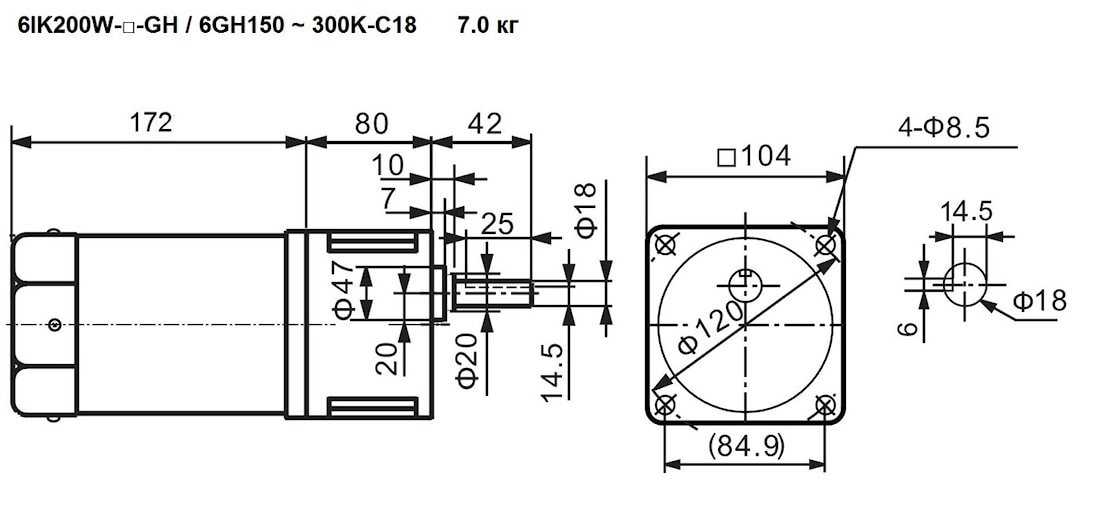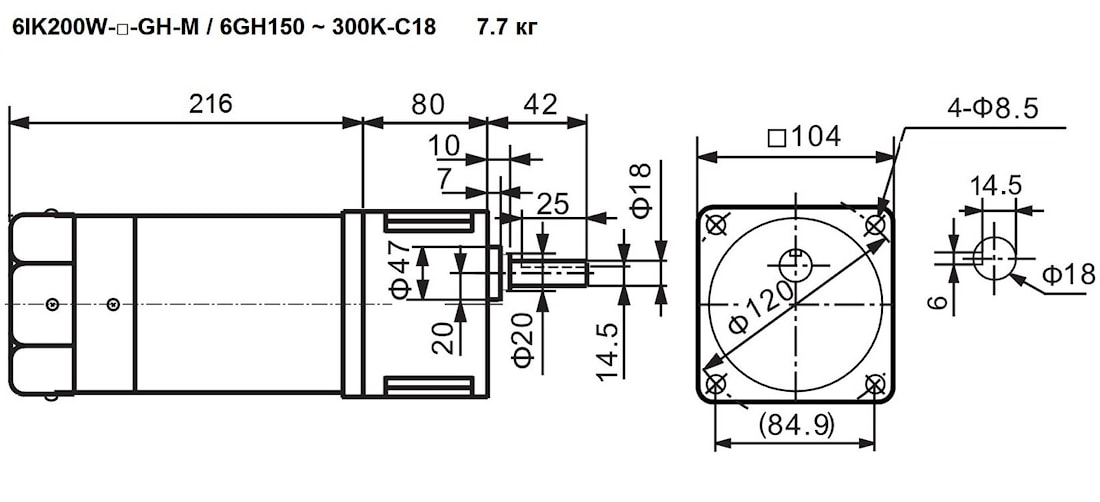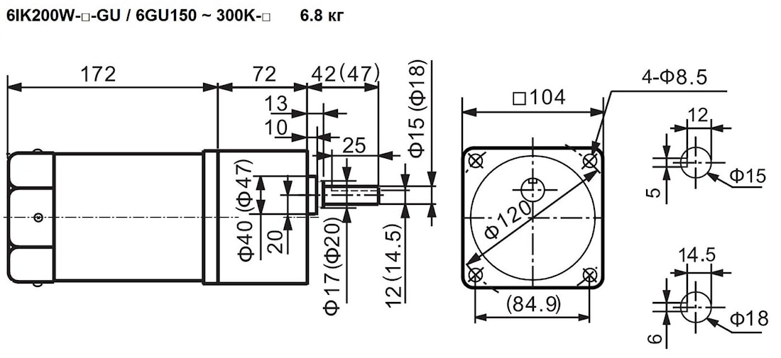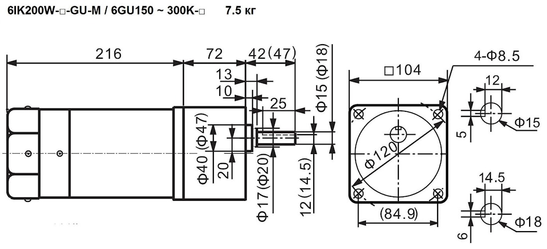 | 6IK200W-GU(GH) 6IK200W-GU(GH)-M | 6GU(GH)120K | 15, 18 | - | 12.5 | 120 | 44 | Стандарт – 6.8 Износостойкий – 7.0 С тормозом – 7.5 (7.7) |
