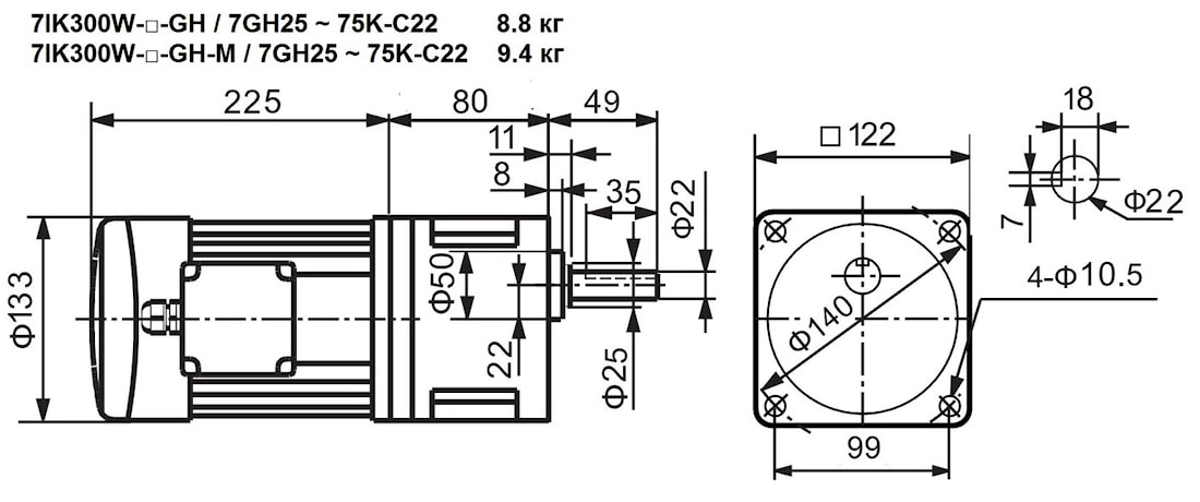 | 7IK300W-GH 7IK300W-GH-M | 7GH25K | 18, 22 | - | 60 | 25 | 38 | Стандарт – 8.8 С тормозом – 9.4 |