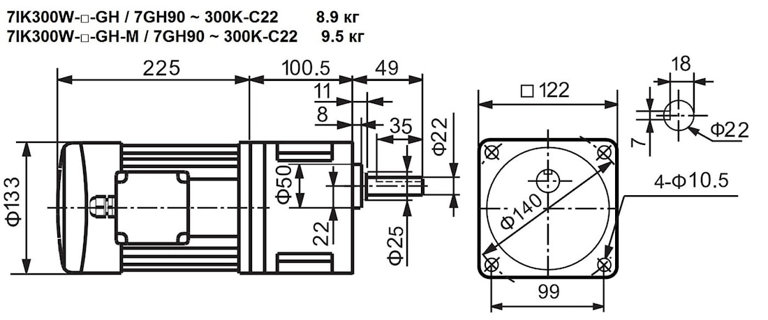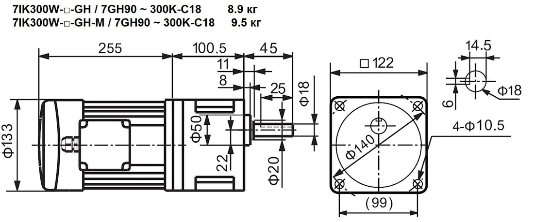 | 7IK300W-GH 7IK300W-GH-M | 7GH90K | 18, 22 | - | 16 | 90 | 85 | Стандарт – 8.9 С тормозом – 9.5 |