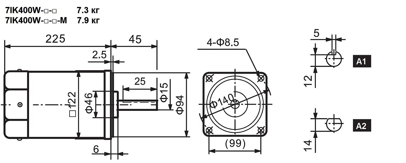 Электрический двигатель марок 7IK400W и 7IK400W-M (номинальной мощностью - 400 Ватт) - представляет собой моторчик компактной формации, цилиндрической формы радиусом d=66 мм, длиной l=225 мм, с монтажным фланцем 122х122 скорость оборотов выходного вала - 1300 об/мин, доступное напряжение 110 В, 220 В, 380 В, пусковые моменты 6,1 Нм и 2,0 Нм, номинальный момент - 2,9 Нм. При однофазном питании для запуска мотора требуется конденсатор: при 110 В - 80 мкФ, 220 В - 20 мкФ. Диаметр вала d=15 (со шпонкой, либо с лыской). По запросу электродвигатель оснащается электромагнитным тормозом.