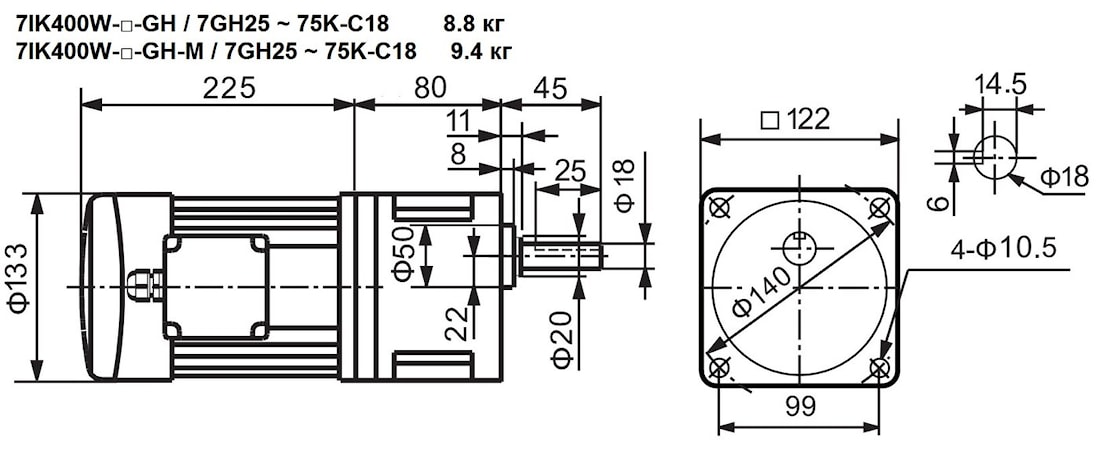 | 7IK400W-GH 7IK400W-GH-M | 7GH25K | 18, 22 | - | 60 | 25 | 50 | Стандарт – 8.8 С тормозом – 9.4 |
