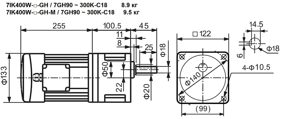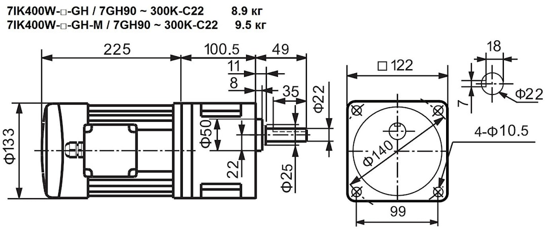 | 7IK400W-GH 7IK400W-GH-M | 7GH90K | 18, 22 | - | 16 | 90 | 97 | Стандарт – 8.9 С тормозом – 9.5 |