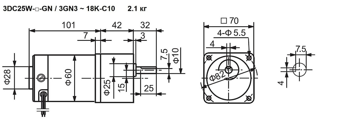 DC мотор-редуктор 3DC25W-GN / 3GN3 - 18 представляет собой миниатюрную редукторную часть, призванную для снижения входных оборотов до 100 об/мин ~ 600 об/мин, и промышленно-бытовой DC-мотор номинальной мощностью 0,025 кВт (25 W), предназначенный для эксплуатации в электрических сетях постоянного тока в 12 В, 24 В, 90 В.степень влаго- и пыле- защищенности IP20,