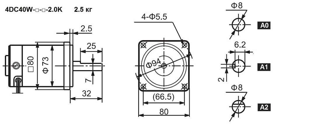 Вал может быть исполнен в трех вариантах: гладкий (А0), с лыской (А2) или шпоночным пазом (А1).