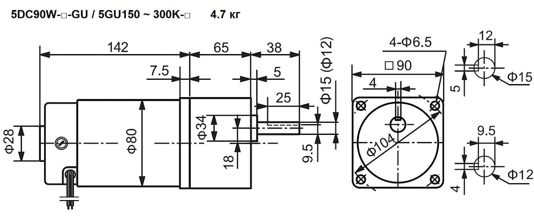 DC мотор редуктор 5DC90W-GU / 5GU150 ~ 300 (90 Ватт) 6.0 об/мин ... 12 об/мин