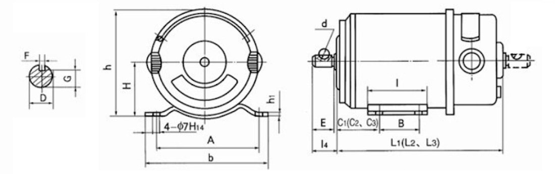 | Модель | H | h | h1 | A | b | B | I | D | E | l4 | F | G | d | m | ||