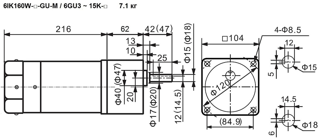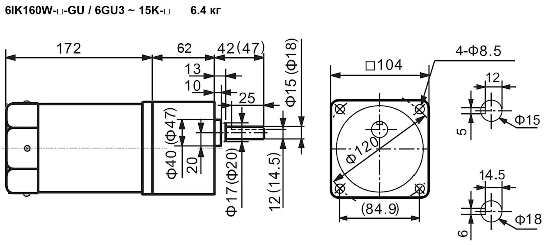| 6IK160W-GU 6IK160W-GU-M | 6GU3K | 15, 18 | - | 500 | 3.0 | 2.85 | Стандарт – 6.4 С тормозом – 7.1 |