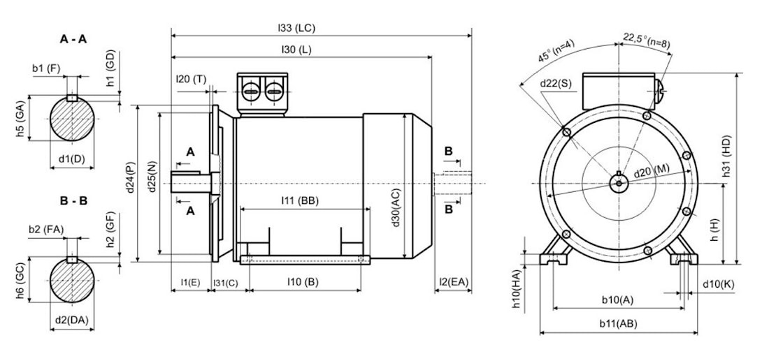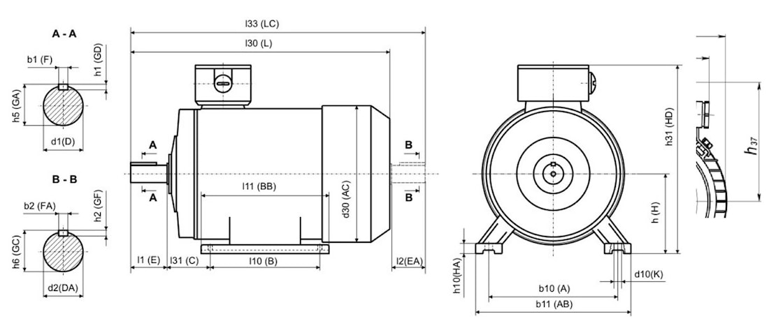 - Присоединительные размеры, исполнение на лапах (IM1081, IM1001, B3):