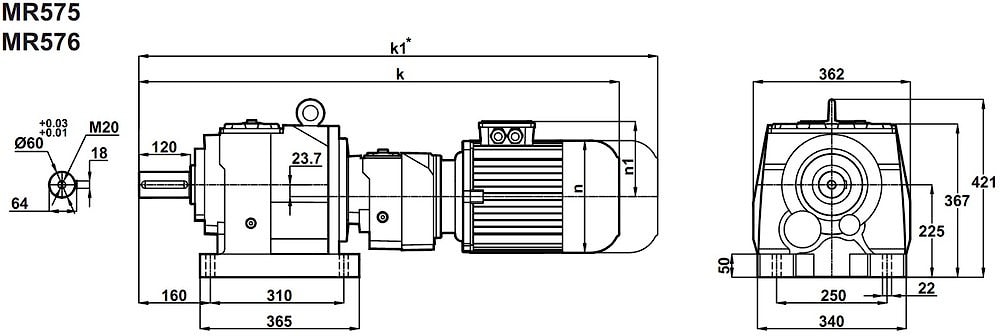 Соосно-цилиндрический мотор-редуктор в пяти ступенчатом варианте MR575-63/4b (исполнение на лапах) и NR575-63/4a (фланцевое исполнение), и шести ступенчатом варианте MR576-63/4b (исполнение на лапах) и NR576-63/4b (фланцевое исполнение) - наиболее тихоходный из соосных цилиндрических редукторный агрегат с электродвигателем переменного тока с мощностью - 0,18 кВт. Привод предлагается как в монтажном исполнении на лапах, так и во фланцевом исполнении.Эффективные передаточные числа для данного габарита i=1000 ~ i=3000 (соответствует рациональному сервис-фактору).