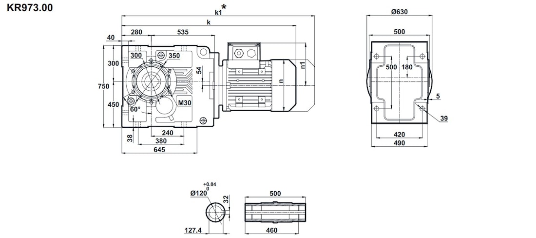 Трехступенчатый коническо-цилиндрический редуктор KR973-280S/4 используется в крупных проектах. Мощность привода 75.0кВт. Вес единицы - 1600кг. Передаточные числа: i=11,96; i=13.06; i=14.65; i=16.51; i=18.73; i=22.05; i=24.73; i=27.88; i=31.63; i=38.21; i=42.86.
