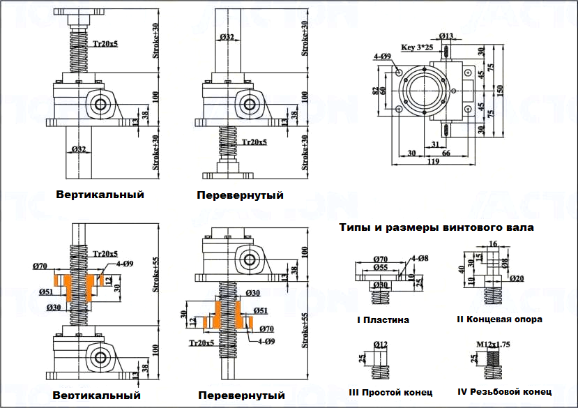 Максимальные статические нагрузки – 0.5т.; Размер винта – TR20x5;