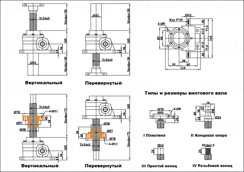 Максимальные статические нагрузки – 1т.; Размер винта – TR24x5;