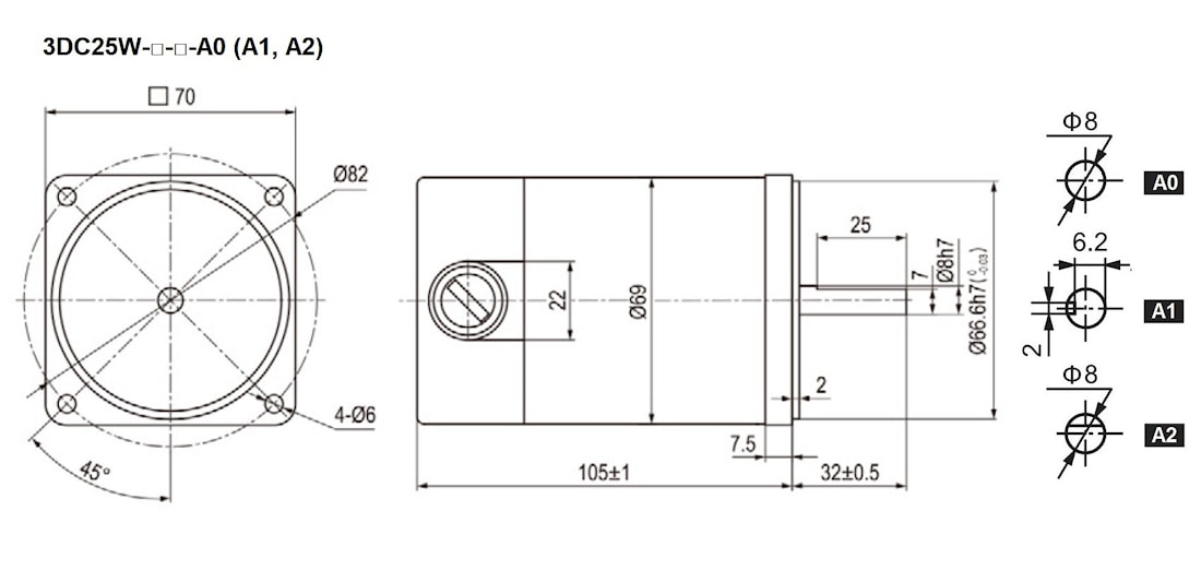 | 3-й габарит щеточного электродвигателя постоянного тока вых фланец □70х70 (см.чертеж) | Мощность | Напряжение | Выходные обороты | Исполнение конца выходного вала |