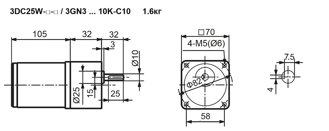 DC мотор-редуктор 3DC25W-□-□ / 3GN3 – 10K-□ представляет собой миниатюрную редукторную часть, служащую для понижения входных оборотов до 300 об/мин … 1070 об/мин, и промышленно-бытовой электродвигатель постоянного тока номинальной мощностью 0,025 кВт (25 W), предназначенный для эксплуатации в электрических сетях постоянного тока в 12 В, 24 В, 90В, 110 В, 220 В.