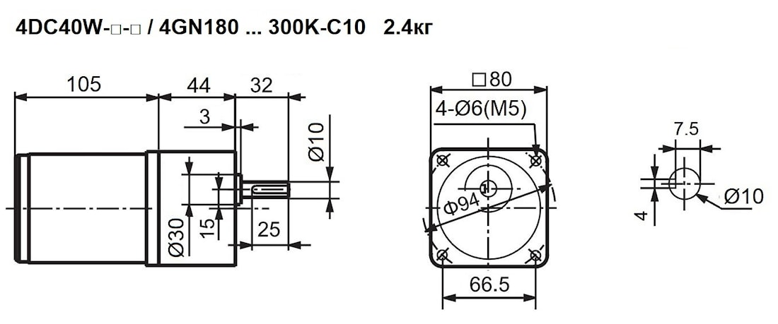 Мотор-редуктор постоянного тока 4DC40W-□-□ / 4GN180 … 300K-□ представляет собой электродвигатель постоянного тока мощностью 40 Ватт (0,04 кВт) и номинальным напряжением 12 В, 24 В, 90 В, 110 В или 220 В; и редукторную часть для понижения выходных оборотов до 6 об/мин … 15 об/мин.