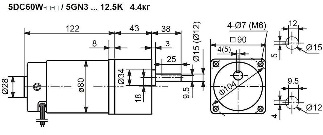 DC мини мотор редуктор 5DC60W-□-□ / 5GN3 …12.5K-□ работает от сети постоянного тока, напряжением 12 В, 24 В, 90 В, 110 В или 220 В. Мощность привода 60 Ватт плюс редукторная часть, диапазоном передаточных чисел от i=3 до i=10, что позволяет снизить выходные обороты до 300 об/мин … 1067 об/мин.