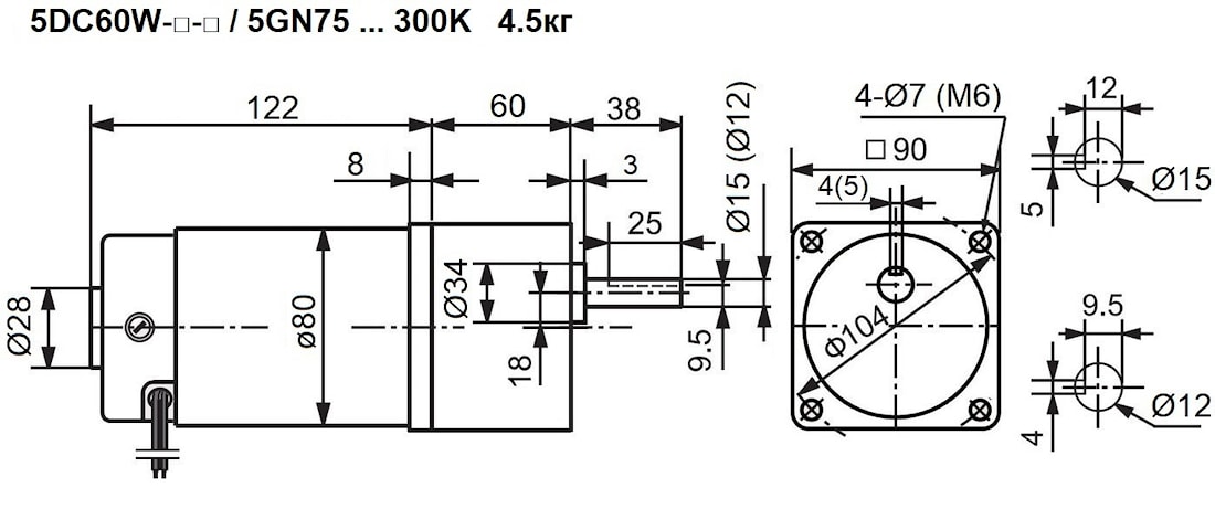 DC мотор-редуктор 5DC60W / 5GN75 … 300K Номинальная мощность – 0.06 кВт Выходные обороты: 6.0 об/мин ... 25 об/мин