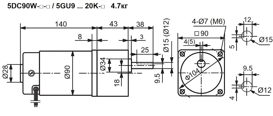 Мини мотор-редуктор 5DC90W-□-□ / 5GU9 … 20K-□ - привод состоящий из двигателя постоянного тока (мощностью 90 Ватт) и цилиндрическим редукторным механизмом. Напряжение электродвигателя 12 В, 24 В, 90 В, 110 В, 220 В, степень влаго- пыле- защиты IP44 (смотри).