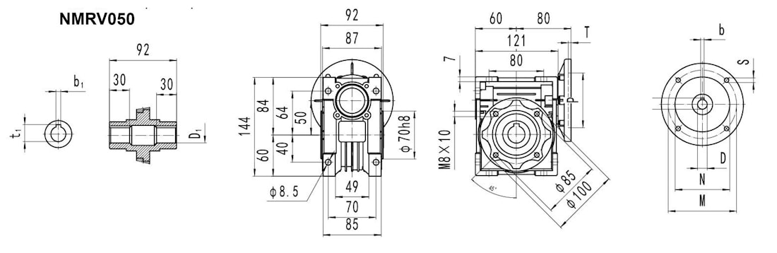 Червячный мотор-редуктор NMRV050 - компактная промышленная зубчатая передача, эксплуатируемая с электродвигателем номинальной мощностью 120Ватт. Диаметр полого выходного вала d=25; совместные передаваемые крутящие моменты. Объемы заливаемого масла составляют 0.15л (причем в различных монтажно-пространственных положениях). Наличие сапуна для испарения газов обязательно. При интенсивных видах работ рекомендуется контроль масла в течении 6 месяцев и замена масла в течении 12 месяцев; при менее интенсивных работах допускается смягчение этих правил.