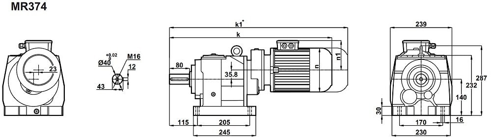 Cоосно-цилиндрический мотор-редуктор MR374-71/6b (исполнение на лапах), NR374-71/6b (фланцевое исполнение), MR374-71/4a (исполнение на лапах),NR374-71/4a (фланцевое исполнение) многоступенчатая редукторная часть, состоящая системы упорядоченных шестерен, располагаемых в прочном монолитном корпусе, и электродвигательная установка мощностью - 0,25 кВт (как правило электродвигатель переменного тока).