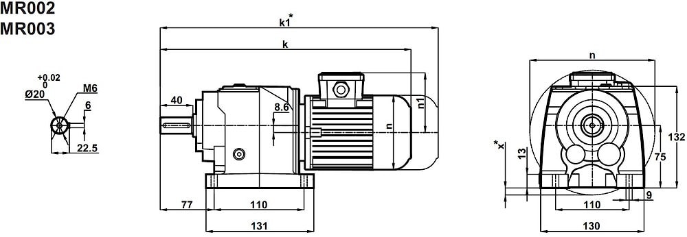Соосный цилиндрический редуктор MR002, MR003 и NR002, NR003 Номинальная мощность - 0,25 кВт Выходные обороты: 80 об/мин ... 400 об/мин