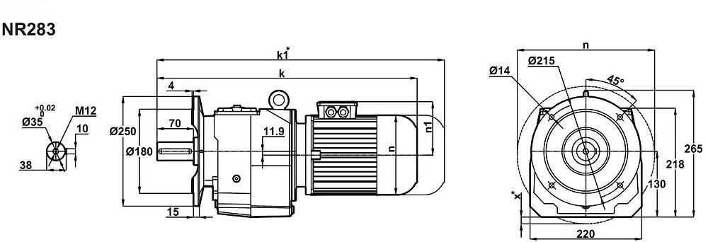 Соосный цилиндрический редуктор MR283, NR283 Номинальная мощность - 0,37 кВт Выходные обороты: 6,5 об/мин ... 16 об/мин