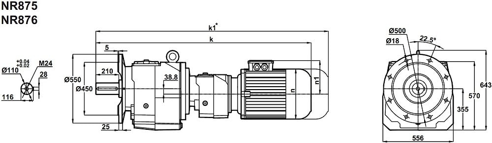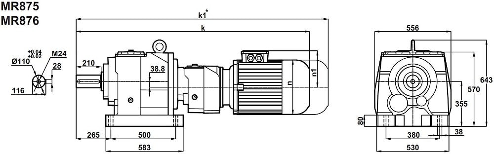 Соосный цилиндрический редуктор MR875, MR876, NR875, NR876 Номинальная мощность - 0,55 кВт Выходные обороты: 0,35 об/мин ... 1,3 об/мин