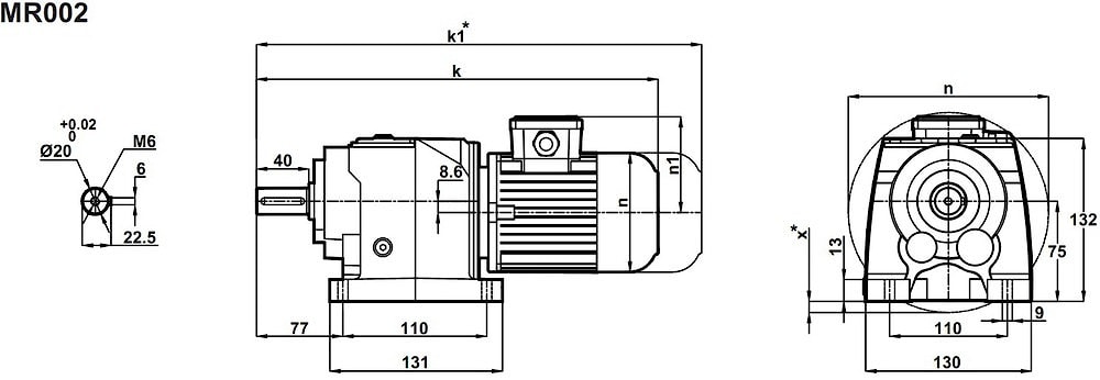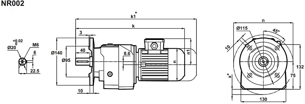 Соосный цилиндрический редуктор MR002 , NR002 Номинальная мощность - 0,75 кВт Выходные обороты: 120 об/мин ... 400 об/мин