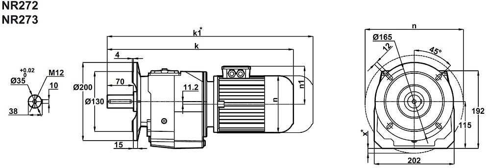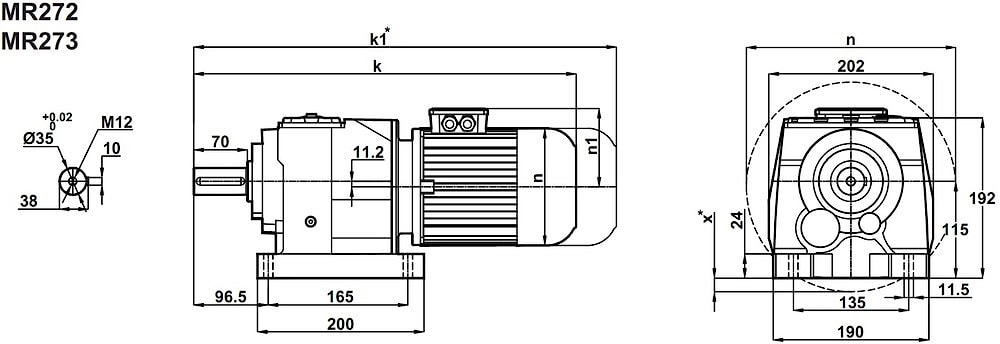 Соосно-цилиндрический мотор-редуктор MR273-90S/4 (исполнение на лапах) NR273-90S/4 (фланцевое исполнение) MR272-90S/4 (исполнение на лапах) NR272-90S/4 (фланцевое исполнение) - цилиндрическая зубчатая трансмиссия, изготовленная, как осевая шестереночная насадка, заключенная в монолитный прочный корпус, для последовательно комплектования с промышленным асинхронным электромотора мощностью 1,1 кВт.рациональные выходные обороты для данного габарита 25 об/мин ~ 75 об/мин (при минимальных требованиях к сервис-фактору). Номинальное крутящее усилия на выходном валу 450 Нм.