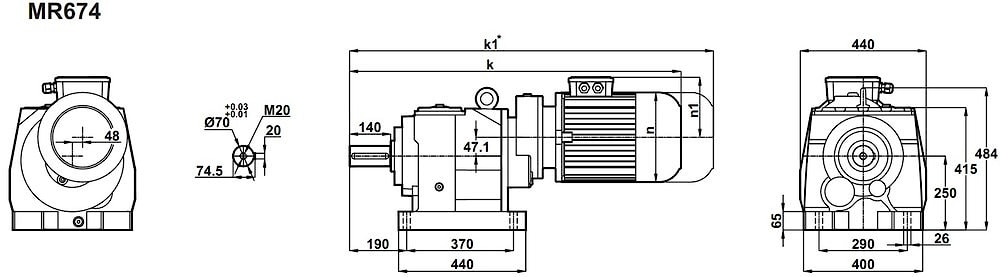Соосный цилиндрический редуктор MR674, NR674 Номинальная мощность - 1,5 кВт Выходные обороты: 3,5 об/мин ... 10 об/мин