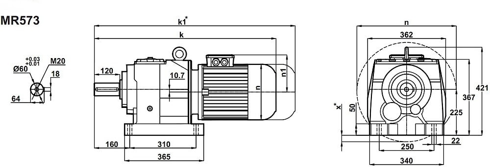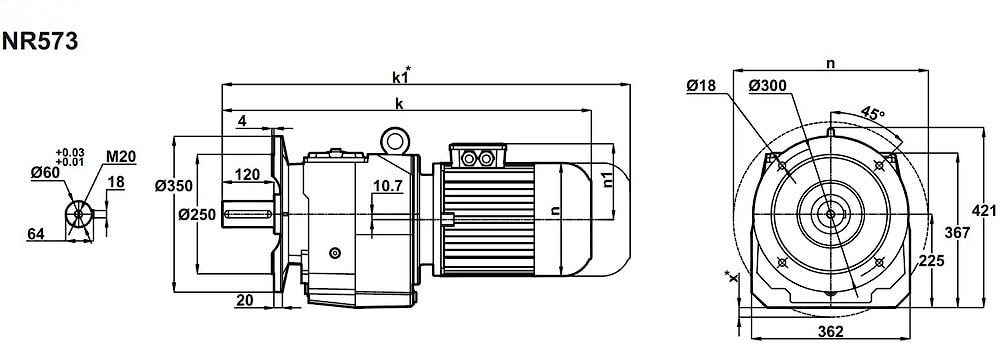 Соосный цилиндрический мотор редуктор MR573-100L/4b (исполнение на лапах) NR573-100L/4b (фланцевое исполнение) MR573-132S/6 (исполнение на лапах) NR573-132S/6 (фланцевое исполнение) - передаточный механизм с цилиндрическим шестереночным зацеплением производится как осевая насадка для электродвигателя мощностью 3 кВт.Наиболее эффективные передаточные числа для привода данного габарита i=45 ... i=97. Номинальный крутящий момент - до 1650 Nm. Радиальные нагрузки на выходной вал - до 25000 N.