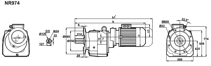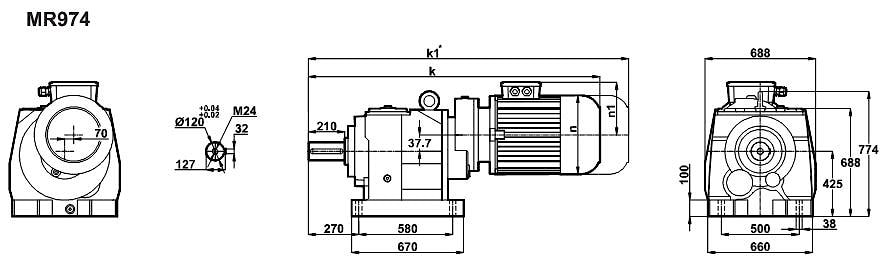 Соосный цилиндрический редуктор MR974, NR974 Номинальная мощность - 7,5кВт Выходные обороты - 3,5 об/мин ... 5,0 об/мин