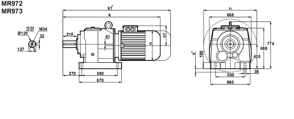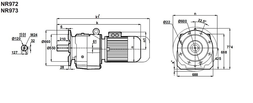 Соосный цилиндрический мотор-редуктор MR973-132M/6 (с исполнением на лапах) NR973-132M/6 (фланцевого исполнения) - это промышленный трансмиссионный редукторный механизм представляет собой соосный привод для функционирования от электромотора мощностью 7,5 кВт, скорость оборотов выходного вала: 4,8 об/мин - 11 об/мин,Номинальный крутящий момент на конце исполнительного вала - 15000 Нм.
