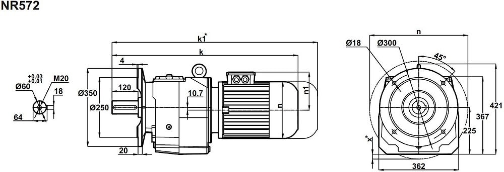 Соосный цилиндрический редуктор MR572, NR572 Номинальная мощность - 18,5 кВт Выходные обороты: 100 об/мин ... 370 об/мин
