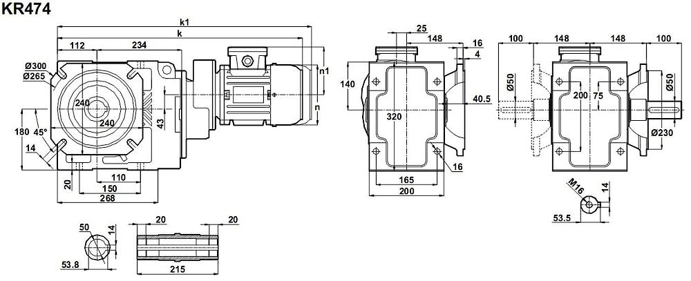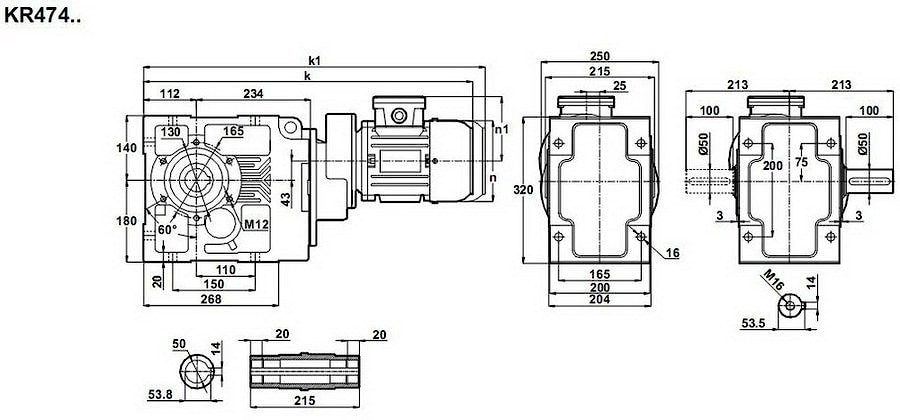 Коническо-цилиндрический мотор-редуктор KR474-80/4a и KR474-80/6b используют для трансмиссионных операциях в промышленном назначении.Конический редукторный механизм служит для пере направления исходящего крутящего момента 1000 Нм - 2000 Нм под углом, при этом первичная энергетическая единица номинальной мощностью в эквиваленте 550 Вт или 0,75 л.с.