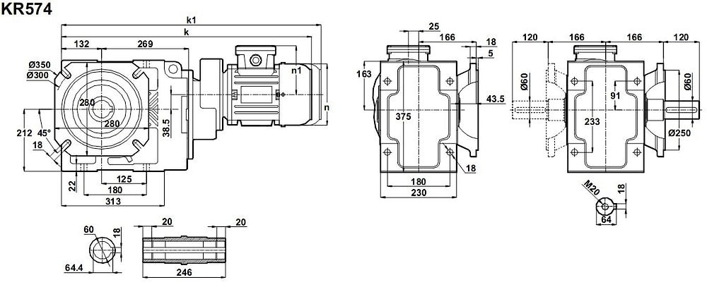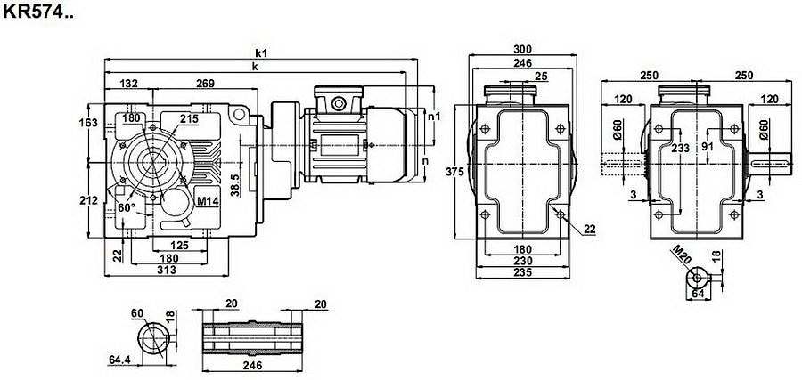 Четырех ступенчатый коническо-цилиндрический передаточный механизм модель KR574-90S/4 представляет собой электрический привод 1,1кВт 220V, 380V и редукторную часть, которая располагается в прочном, хорошо обдуваемом корпусе, и состоит из конической ступени и трех последовательных трех цилиндрических ступеней зубчатых колес.Обороты на выходном валу от 3,0 до 10 об/мин.