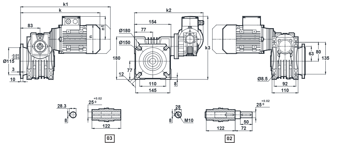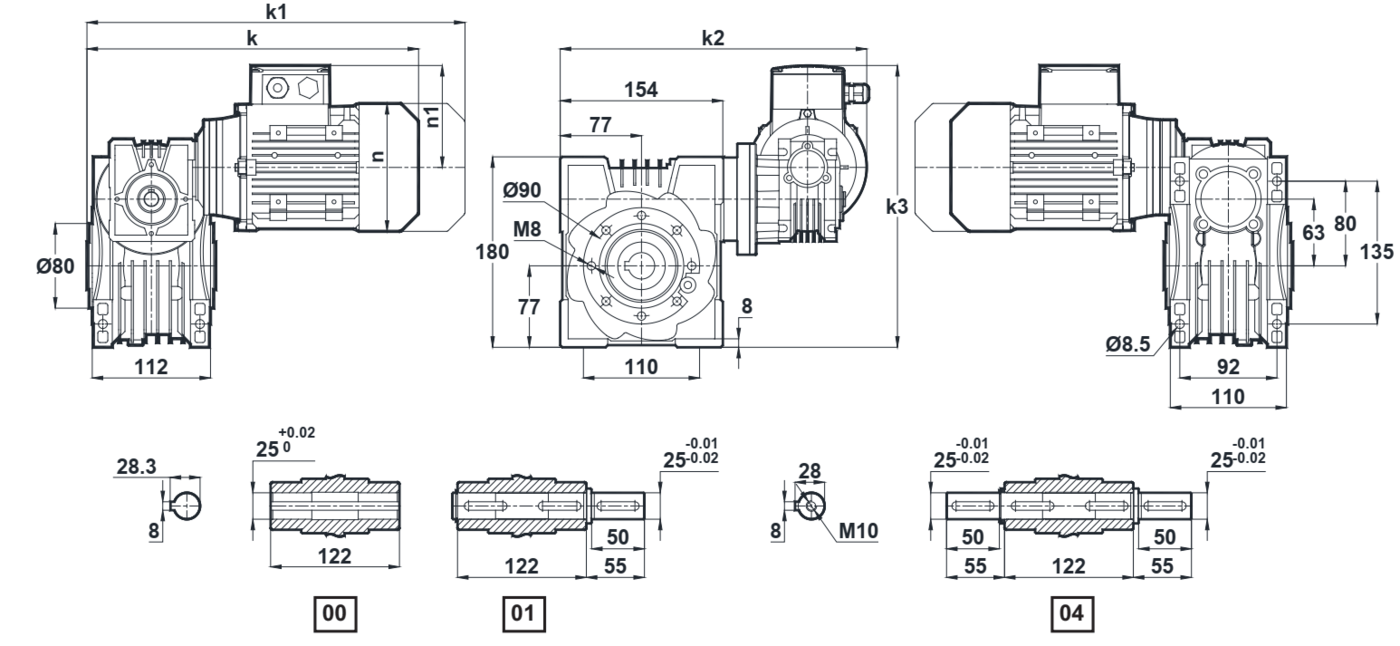 Присоединительные размеры полнотелых и полых валов, а также выходных фланцев изготавливаются в различных вариантах, что позволяет потребителю без проблем интегрировать мотор-редуктор в свои проекты(см. дополнения).