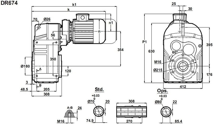 Цилиндрический мотор-редуктор с параллельным валом DR674-80/4b и DR674-90S/6 (насадной мотор редуктор , вертикально цилиндрический мотор-редуктор, торцевой мотор-редуктор , мотор-редуктор с полой втулкой на выходном валу) - электромотор с номиналом 0,75KW и эффективным четырех ступенчатым редукторным механизмом, достигаются высокие передаточные отношения: 280/1 , 320/1 , 360/1 , 425/1 , 500/1 , 600/1 , 675/1 .Вращающие моменты: 1300 Nm - 4300 Nm.